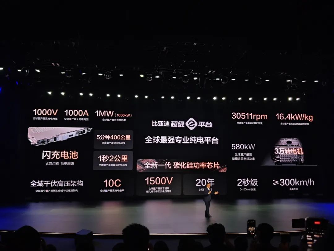 新闻发布会的主角是“非常E平台”,比亚迪集团董事长兼总裁王传福宣布,配备非常E平台的比亚迪车型支持1000V电压、1000A电流,实现1兆瓦(1000kW)充电功率和10C充电倍率。