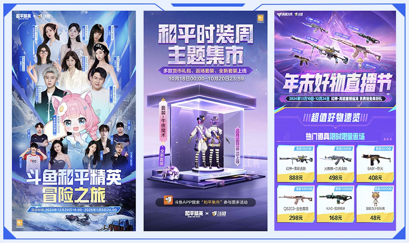 此外,斗鱼还提高了以游戏道具为主的商业业务推广频率,开拓了更多的营销场景。线下内容结合线上销售,努力提高用户的消费意愿。比如和平精英分区推出和平时装展主题市场、商业手册等营销活动,年底推出好货直播节。