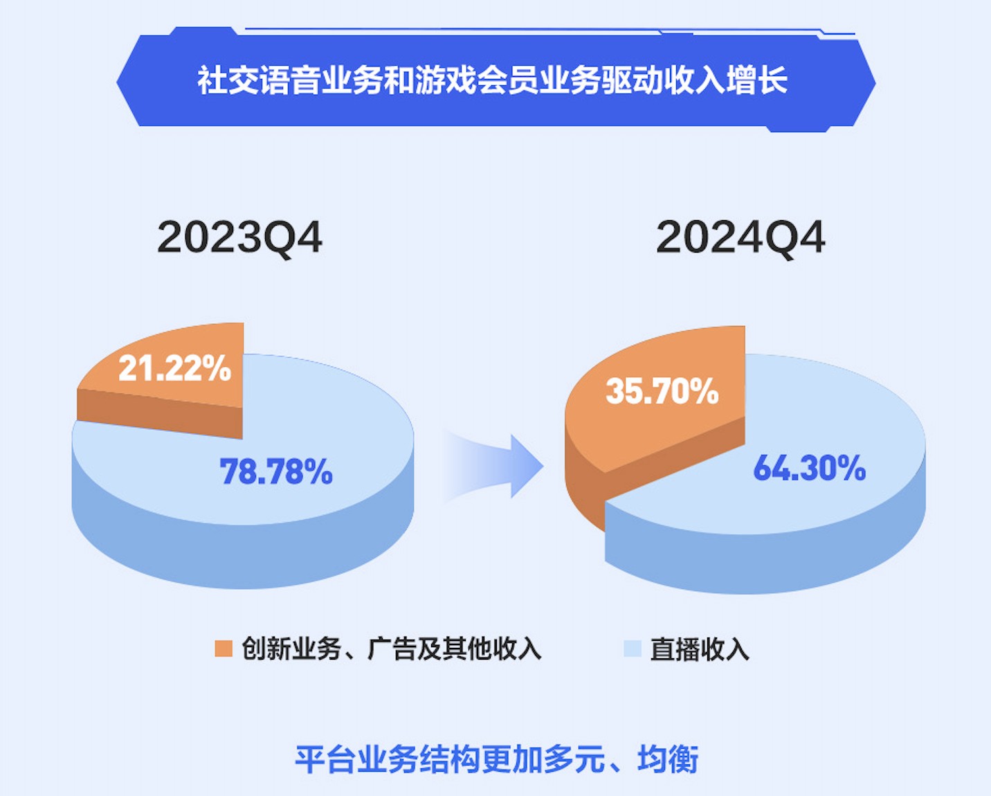 2024年第四季度,斗鱼加大了对游戏相关服务和语音业务的推广力度。财务报告明确表示,由于标准化的产品设计、有效的招聘制度和准确的客户投入,创新业务、广告等收入的增加,斗鱼基于语音的社交网络服务和游戏会员服务的收入增加。