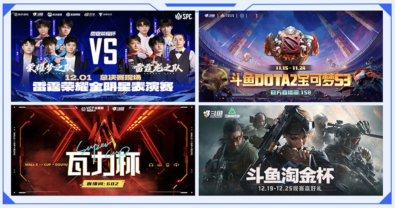自制力比赛是斗鱼展示自己内容专业性和突破性的优势领域。一方面,斗鱼围绕职业队伍、特定主播和主播群体推出创新比赛,如《无畏契约》瓦力杯集结了8支职业队伍参赛。另一方面,《王者荣耀》军团杯和雷霆荣耀杯S2作为雷霆荣耀杯的全新IP升级,依托平台硬核游戏分区优势,继续跨平台内容合作,进一步激活分区活动,有效持续官方休赛期电竞生态热度。