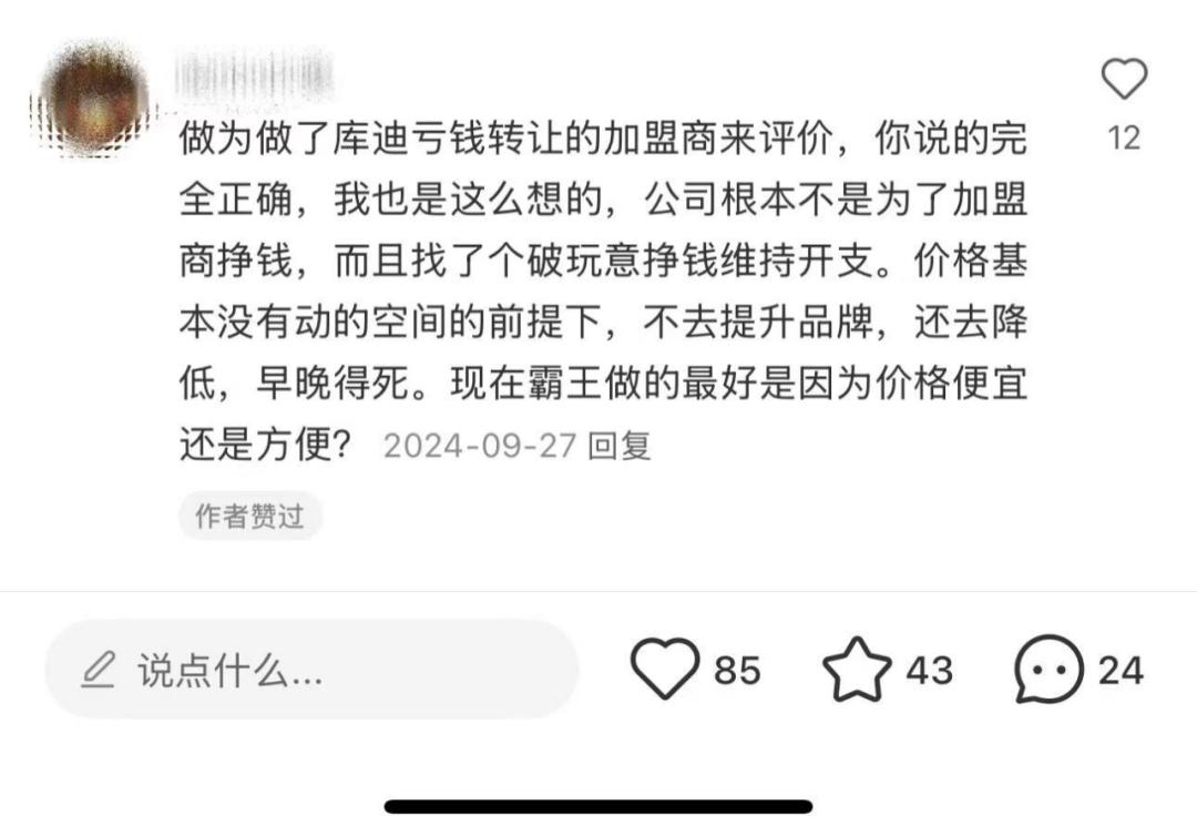 更现实的问题来自于库迪的“追风转型”,让加盟商不知所措。频繁的调整策略导致很多加盟商亏损,闭店率居高不下。如果加盟商面临着“开店亏损,关店止损”的死亡循环,规模的意义是什么?