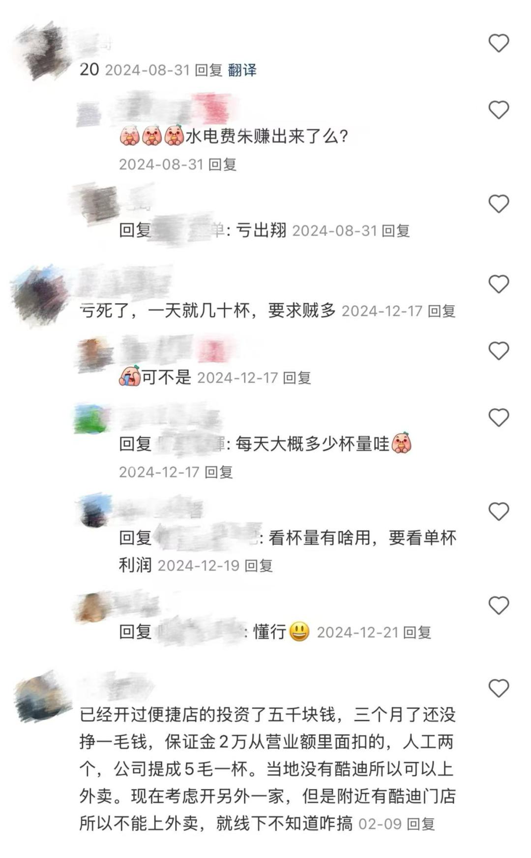 “夫妻店位置不好,每天收入400多,还不如工作。开业的时候区域经理也说位置不错,其实一点都不好。而且做的时候说要保证5万的实际投入,设备和装修已经超过了。和最近的一家库迪店隔着一条主干道,但是直线距离不到一公里,不能做外卖,不想回到原来的样子。”