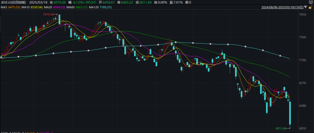 自上周四以来,印尼综合指数连续四个交易日下跌。今天,印尼股市大幅下跌,印尼综合指数下跌7%以上,创下2021年9月以来的新低。印尼综合指数自2024年9月创下7910.56点历史新高以来,跌幅超过20%,进入技术熊市。