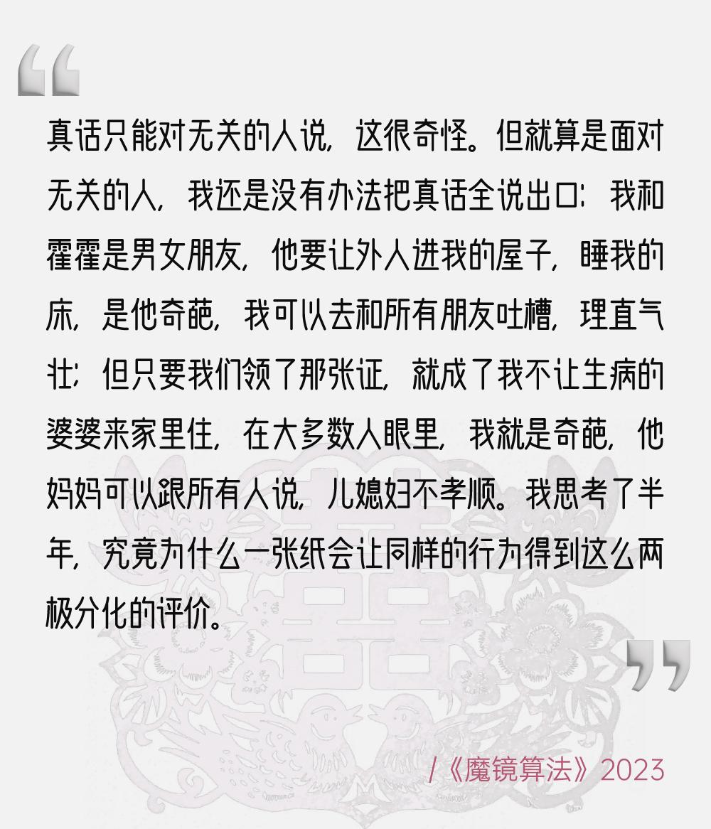 后来我意识到了也许是因为《2181》构建了一个女性作为推动者的故事,《魔镜算法》将会遇到更多女性面临的质疑和困境。它写的更多的是我作为一个中年女性面临的困难。它讨论了很多问题,比如单身,老龄化,男女关系,包括新技术发展对我们生活的改变。