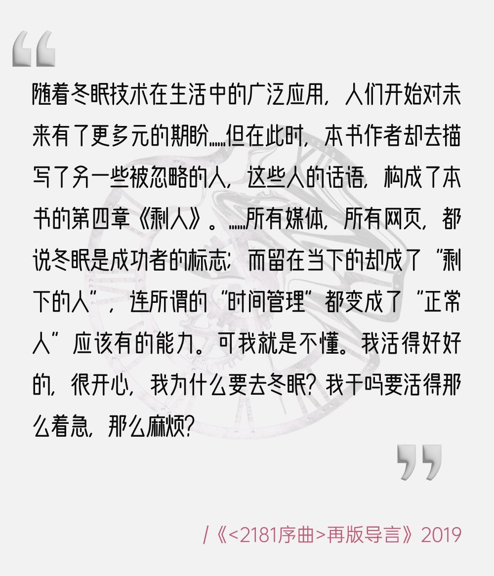 后来,当我重读这两本书的时候,我觉得在《莫比乌斯时空》阶段,我在写男主角的时候也很努力。他们更像是带着“个人设计”来推动故事。但是《2181序曲》只需要一点点,作者让角色自己去寻找她的命运。