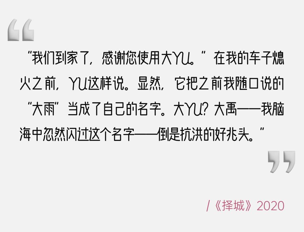 2022年,顾适受亚利桑那州立大学邀请,创作了一部关于气候变化的科幻短篇小说。自然,她想起了中国文化中的“大禹治水”,从题目中“海平面上涨-洪水爆发”的逻辑链。于是我写了《选城》,想象了一个名字“YU在未来的大洪水时代,人工智能导航系统为人们安排了最佳的逃生路线。