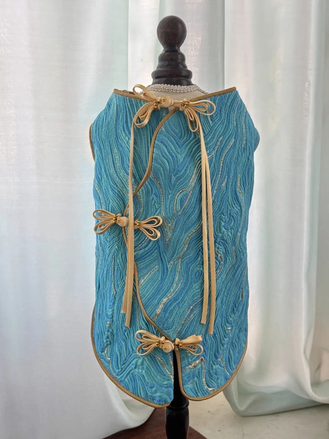 前几天,“后浪研究所”在一家咖啡店遇到了臧硕。她带着一个狗模型来到这里,表面有一件她最近设计的湖蓝色新中式背心。背心是她用旗袍剩下的面料做的,背面有三个漂亮的蝴蝶结扣。面料上的金银云纹让狗看起来优雅而华丽。