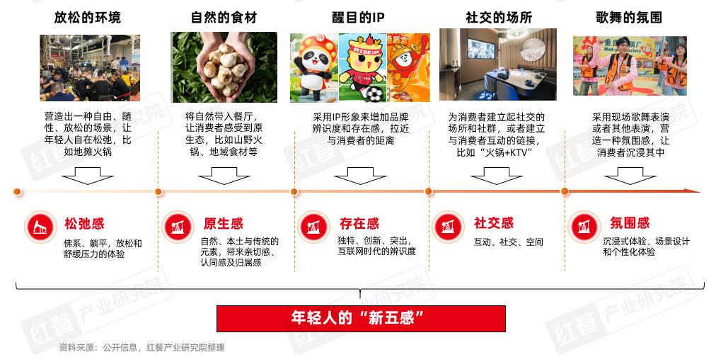 与传统的五感不同,现在年轻人更注重五感的体验。这些感受都是以“精神价值”为目标的。餐饮品牌在这些方面积极满足年轻人的新需求。比如地摊火锅让年轻人下班后可以自由放松。山野火锅给消费者带来了亲近自然的机会。“ KTV”“ 这部电影让餐馆更适合社交。