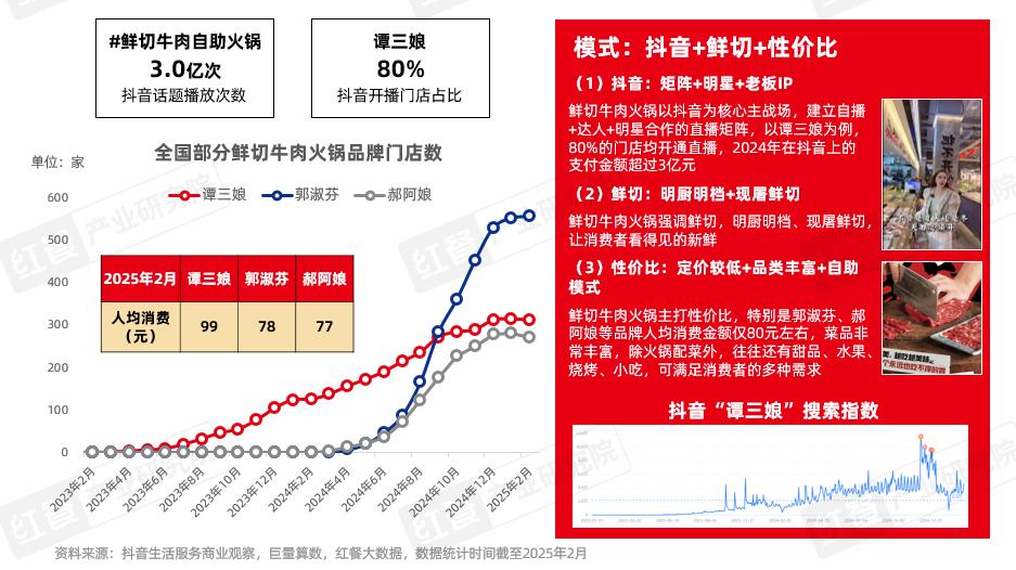 2024年,以抖音为核心传播阵地的鲜切牛肉自助火锅快速增长,主要有三个原因:(1)以抖音为主战场,打造直播。 明星 老板IP的直播矩阵实现了线上交易;(2)满足客户对新鲜食物的需求,明厨明档,现屠新鲜食物;(3)性价比高,自助方式结合价格低,品类丰富,让客户普遍意识到物有所值。