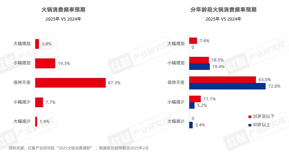 根据红餐产业研究院的“2025火锅消费调查”,从消费预期来看,2025年火锅消费预期有所改善, 2025年火锅消费频率上升的消费者比例高于消费者比例下降,说明2025年需求估计有所增加,其中年轻人较多。
