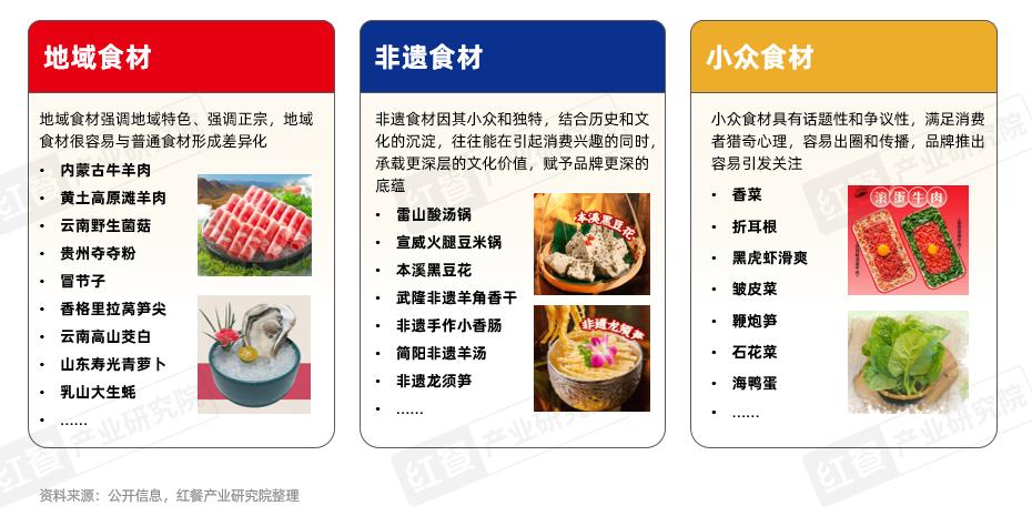 在食材方面,区域性食材、非物质文化遗产性食材和小众食材是近年来火锅食材创新的主要方向。在社交媒体等因素的帮助下,这三种食材很容易流行起来。一方面,这些食材往往因为小众而独特,客户容易对早期采用者产生兴趣;另一方面,很容易有话题,在互联网上很受欢迎。此外,火锅品牌的积极跟进促进了这些食材的普及。