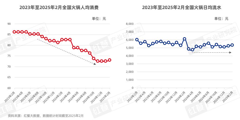 自2023年第四季度以来,火锅的人均消费量一直在下降,从2023年80多元的人均消费量一直在下降到2024年底的70多元。一方面是因为消费降级导致追求性价比的趋势,另一方面是因为火锅品牌的快速增长降低了火锅整体的人均消费水平。