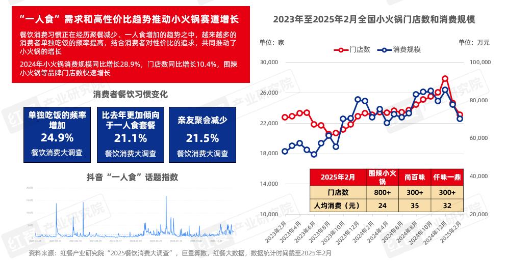 顾客的餐饮消费习惯也在发生变化。一方面,商务宴请和亲戚朋友聚会都在减少;另一方面,一个人吃饭的次数在增加,这促进了小火锅赛道的普及。根据红餐大数据,2024年小火锅消费规模同比增长28.9%。过去一年,围辣火锅、尚百味等主要性价比小火锅品牌的门店数量迅速增长。