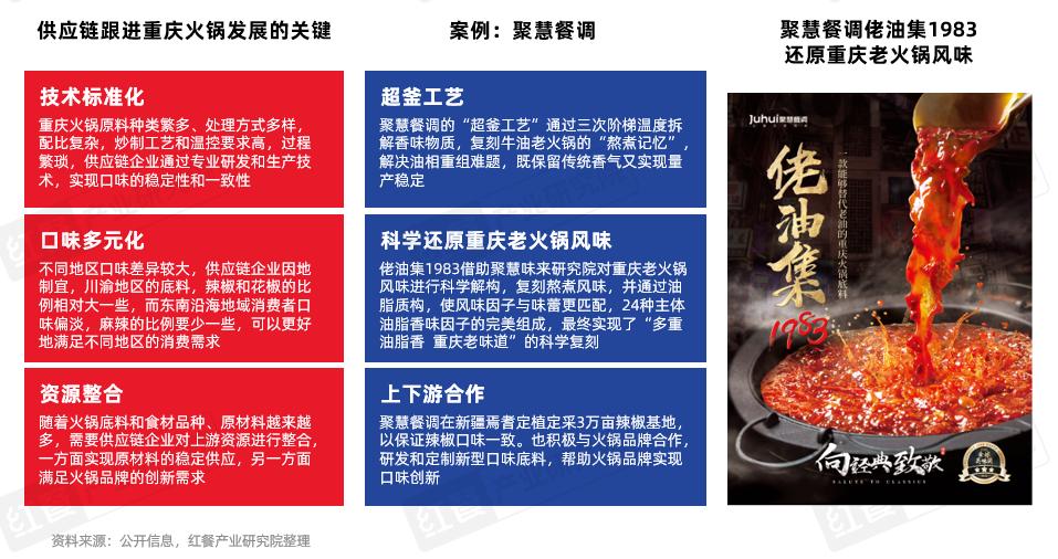 重庆火锅不断迭代发展,供应链企业积极跟进。以聚汇餐调为例,聚汇餐调致力于恢复重庆老火锅的风味,通过超釜工艺复制黄油老火锅的“烹饪记忆”,推出了1983年重庆火锅底料和24种主要油脂风味因素的完美构成,最终实现了“多重油脂风味” 科学复刻重庆老味道。