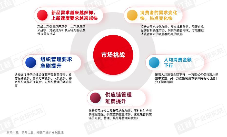 随着消费者需求的快速变化、热点的快速变化和火锅品牌的新速度的加快,市场带来的挑战越来越大,人均消费金额的减少带来的压力越来越大,对企业内部组织管理和外部供应链管理的要求也越来越高。