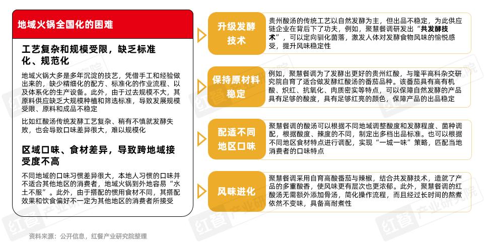随着酸汤火锅的普及,聚汇餐调等供应链企业迅速跟进。一方面,原材料和生产工艺可以通过原材料的合作和技术标准化,产品可以稳定生产;另一方面,在实现风味升级的同时,可以根据酸值和辣度的不同,制定多档生产标准,满足不同地区消费者的口味差异,实现酸汤火锅等地区口味的全国化。