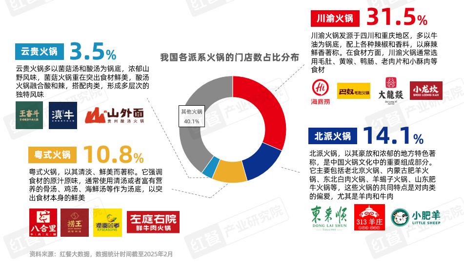 目前,火锅各派的发展情况各不相同。2024年以来,重庆火锅作为经典口味的代表,热度最高,店面增长率更高。酸汤火锅在创新口味中成为黑马,促进了云贵火锅的发展;北方火锅的增长主要依靠性价比高的牛肉火锅;粤式火锅处于店铺数量略有下降的趋势。