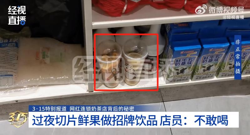 湖北经视的“3月15日特别报道”曝光了宜昌一家蜜雪冰城店使用隔夜水果的问题。店员在常温下偷偷将未使用的水果放在监控死角,并表示这是“正常使用”。