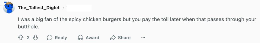 一位顾客留下评论:“我很喜欢辣鸡汉堡,但是当它穿过你的菊花时,你会付出代价。”