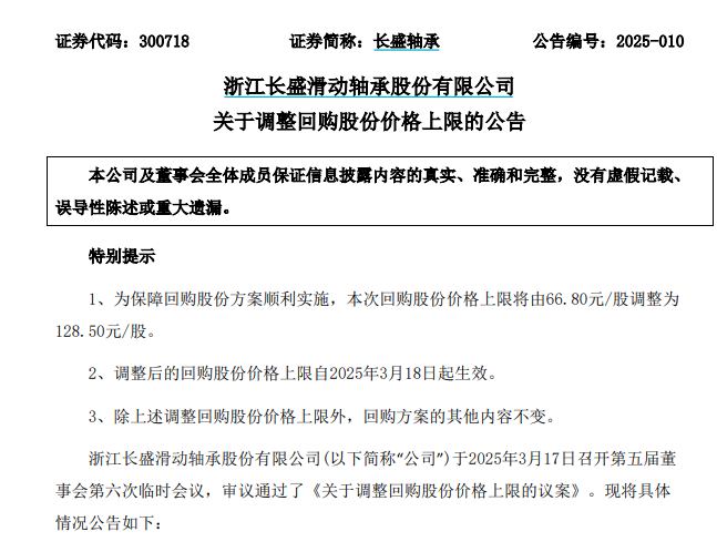 3月17日晚,长盛轴承宣布,公司将回购价格上限从66.80元/股调整至128.50元/股,考虑到近期公司股价持续超过回购股份计划拟定的回购价格上限,基于对公司未来可持续稳定发展的信心和对公司价值的认可,为保证回购股权策略的顺利推进,调整后的回购股份价格上限将于3月18日起效。