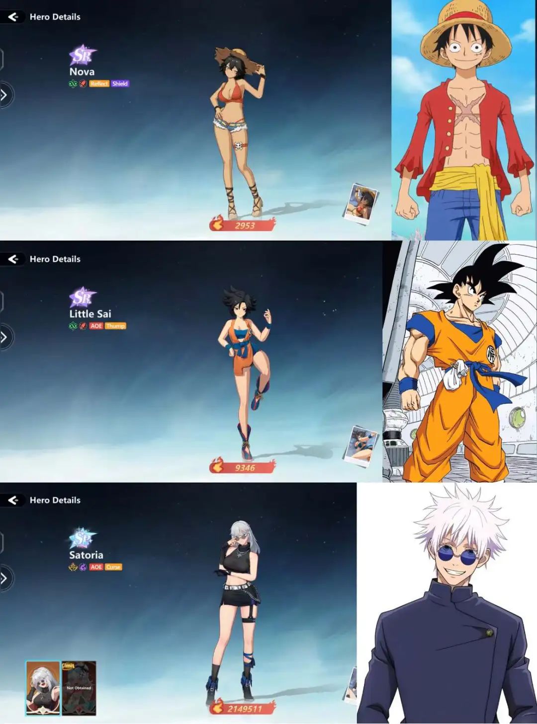 这个游戏以放卡为核心玩法,最大的特点就是将日本动画中的大量人气男性角色放在日本动画中。「娘化」,《海贼王》、《七龙珠》、《火影忍者》、《咒术回战》、《鬼灭之刃》等热门作品都未能幸免。这些娘化人物的设计一般都保留了一些原始人物的代表性特征,包括装饰品、颜色、招数能力、性格特征等。,一眼就能捕捉到视觉感。