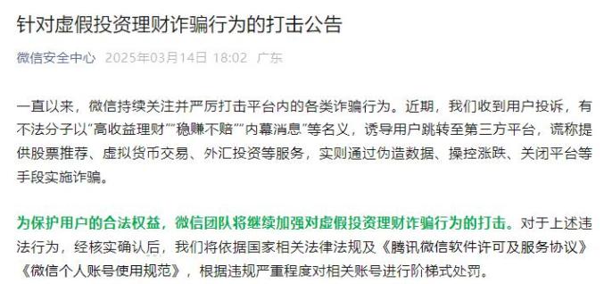 为了保护用户的合法权益,微信团队将继续加强对虚假投资理财诈骗的打击。对于上述违法行为,经核实确认后,微信安全中心将根据国家相关法律法规和《腾讯微信软件许可及服务协议》和《微信个人账户操作规范》对相关账户进行分步处罚。