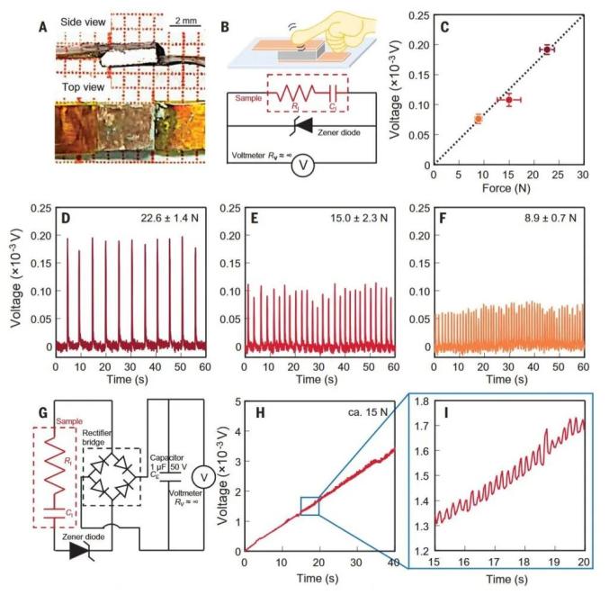 图3. TiCoSb压电传感器的压力灵敏度测试和电容充电测试© 2025 AAAS