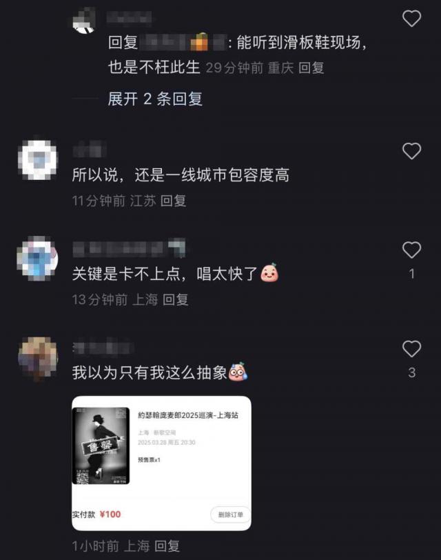 事实上,不仅仅是“上海朋友”买了他在上海站的所有表演票。在评论区曝光购票记录的宋女士告诉记者,虽然她住在浙江宁波,但来回上海是她的“日常生活”。每个月,宋女士都会来上海看比赛、音乐剧和 Livehouse。