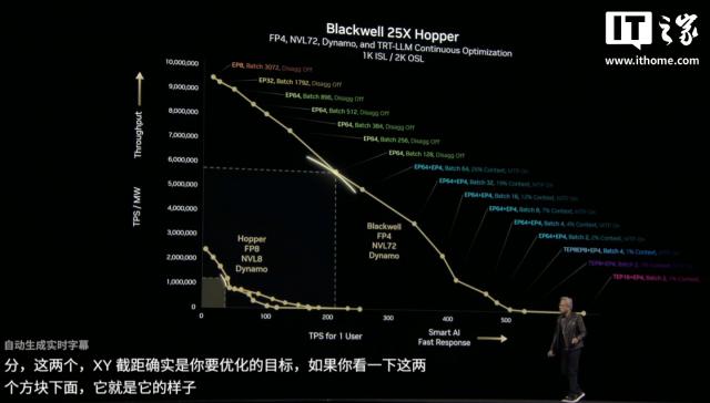 黄仁勋展示了一张关于推理的图表,X 每秒都显示客户的轴 Token 数,Y 轴线显示工厂每秒 Token 数。