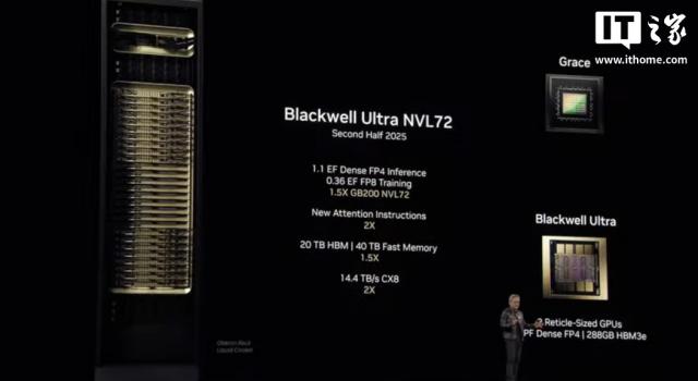 IT 世家 3 月 19 日消息,今天凌晨的英伟达 GTC 2025 英伟达在会上 CEO 黄仁勋发布了 Blackwell Ultra NVL72 平台,该平台将在 2025 年年底推出,带宽和两倍 1.5 内存更快一倍。