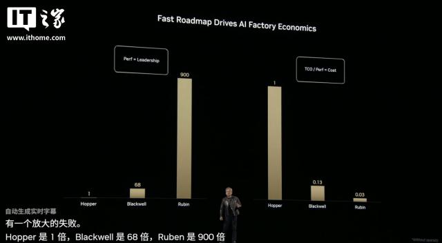 展示了黄仁勋 Vera Rubin NVLink576 外观及参数,并宣称 Rubin 的性能可达 Hopper 的 900 倍,而 Blackwell 是 Hopper 的 68 倍。