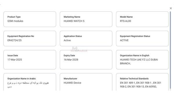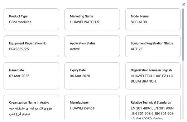 此前,华为 WATCH 5 的型号" SOC-AL00 "已通过 TDRA 认证。这次,另一种模式" RTS-AL00 “还通过了认证。这两种类型的认证代码分别是“ ER42369/25 "和" ER42724/25 ",都被归类为 GSM 这意味着他们都支持模块。 GSM网络连接(全球移动通信系统)。
