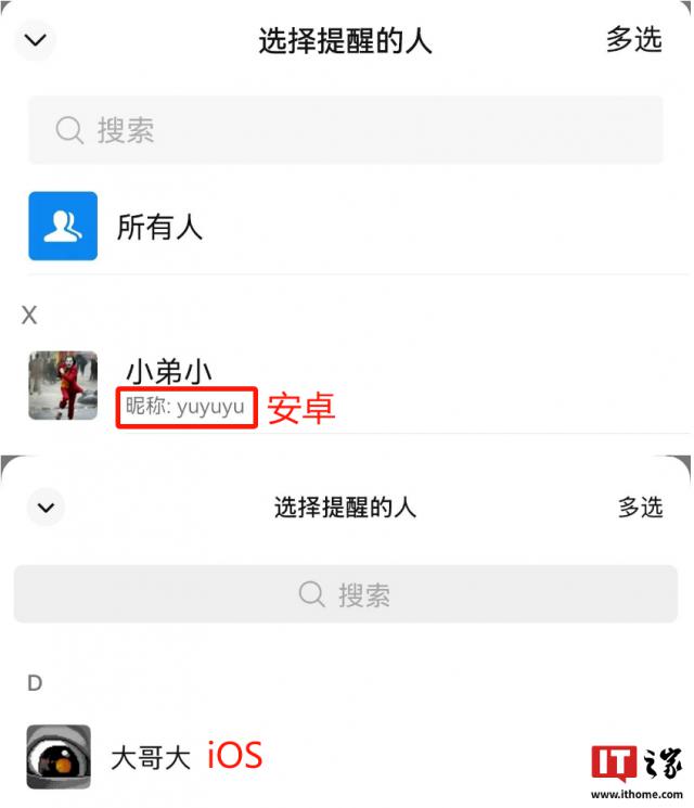 另一个是展示好友的昵称,在安卓端,不管是群聊, @朋友,或者引用消息后, @在“选择提醒的人”页面上,朋友们不仅会显示备注,还会显示昵称。