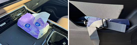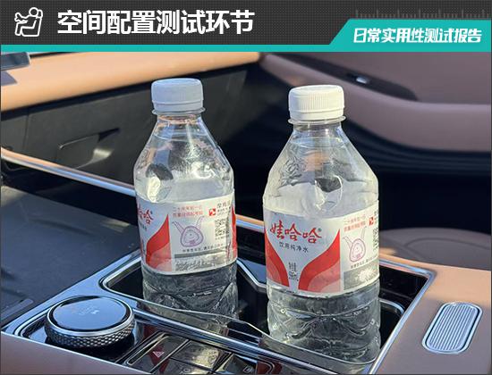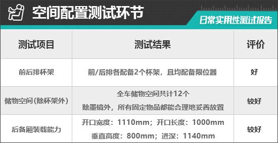 对车内使用空间的检测,仅针对前排触手可及的空间,不包括手套箱、中央扶手箱等需要启动的空间。测试方法是将以下所有固定物品放置在前排的每一个储物空间中,通过固定物品的放置状态来判断车辆储物空间的性能。检验选定的固定物体如下:2 一瓶常规大小的矿泉水, 大屏幕手机,1 支口红、1 个挎包、1 副墨镜、1 把折叠伞和 1 包装常规尺寸的抽纸。