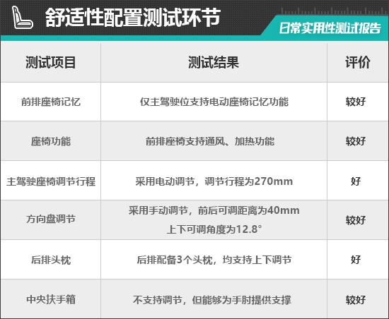 评测车子主 / 副驾驶座椅支持电动调节,前排座椅支持加热通风功能,整体性能显著。此外,主驾驶座椅还配备了座椅记忆功能,方便性好。座椅各功能按钮布局合理,日常操作方便。
