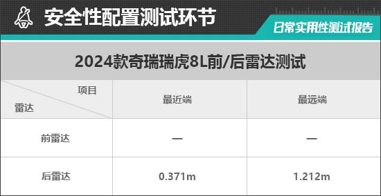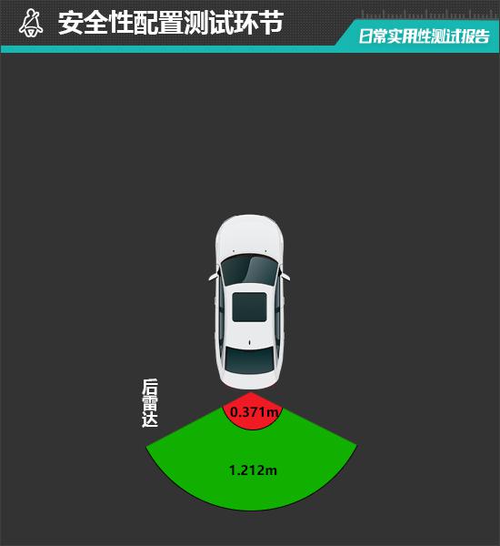 测试过程中,由于测试车没有配备前雷达,无法测量有效数据。倒车雷达 1.212m 后面的物体可以在任何地方感应,雷达功率较低。根据实测数据,评估汽车倒车雷达持续蜂鸣提醒距离为 0.371m,未达到同级平均水平。