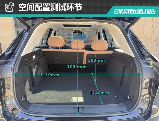 我们还对后备箱的基本值进行了实测,张口长度为 1000mm;张口宽度为 1110mm;后备箱进入深度 1140mm;后备箱台与上面的垂直高度为 800mm。