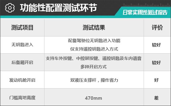 对消费者而言,门槛离地高度在一定程度上决定了上下车的便利性。根据实际测量结果,对汽车门槛离地高度的评估 470mm,处于同级别车型下游水平,驾驶员每天上下车稍有不便。