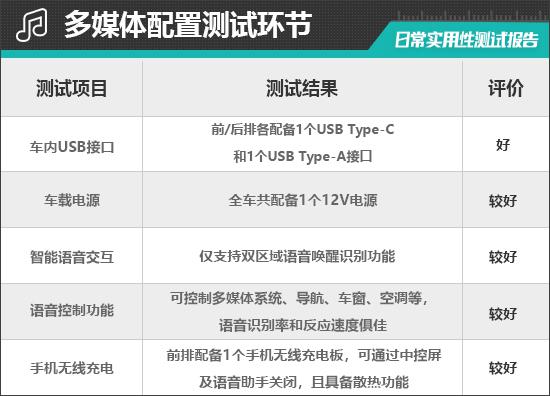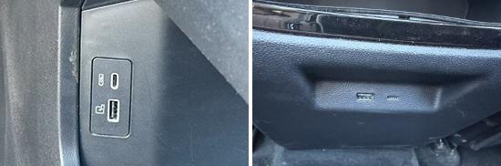 评测车子前 / 后排各配置 1 个 USB Type-C 接口和 1 个 USB Type-A 接口,前者位于中控台下方,后者位于后空调风口下方,布局合理,兼容性好。此外,中控台下方还提供 1 个 12V 电源接口,能满足车内乘客多种电子产品的用电需求。