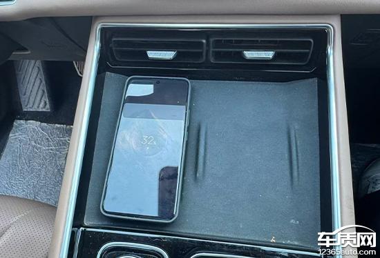 评估车配置在前排 1 个 50W 手机无线充电板,位于仪表盘下方,拿放手机非常方便。而且充电功能可以通过中控面板手动关闭,具有散热功能,非常实用。