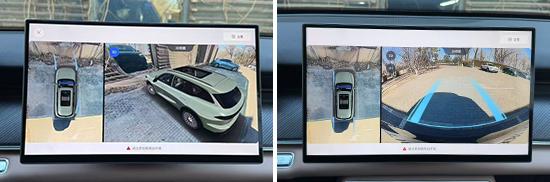评估车辆的配置 360 全景图像,实测整体画质清晰度好,无异常。同时,图片支持多角度查看,并配有可随动转向的倒车辅助线,帮助驾驶员更容易完成倒车等操作,实用性能符合预期。