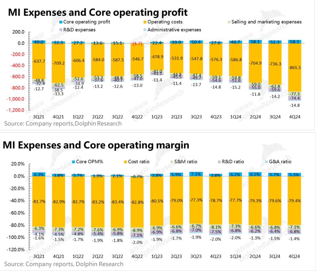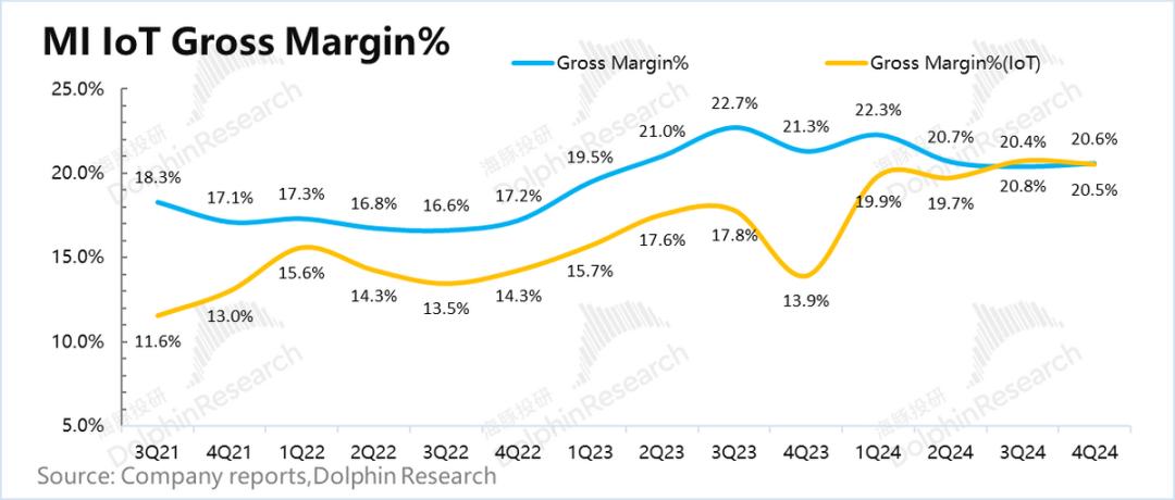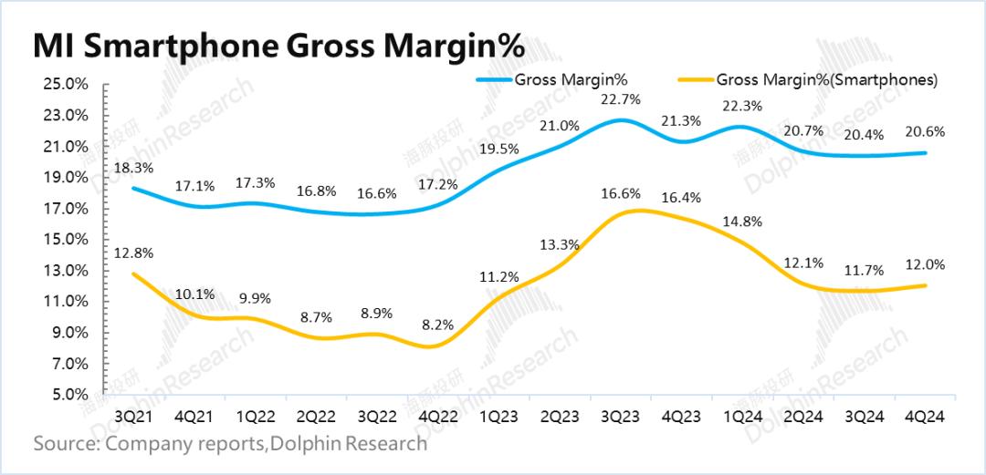 2024年第四季度小米集团毛利率为20.6%,与市场预测20.7%基本一致。由于去年手机零部件成本低,数量很高,同比毛利率下降0.7%,但是这个毛利率本身就不错。