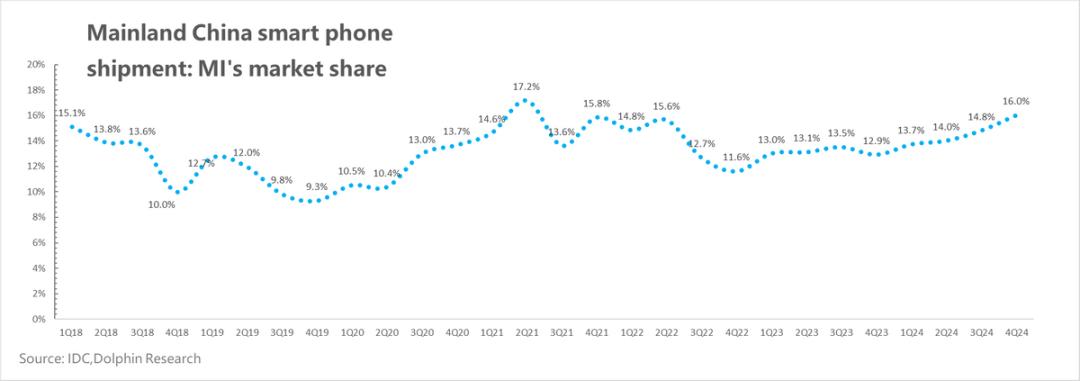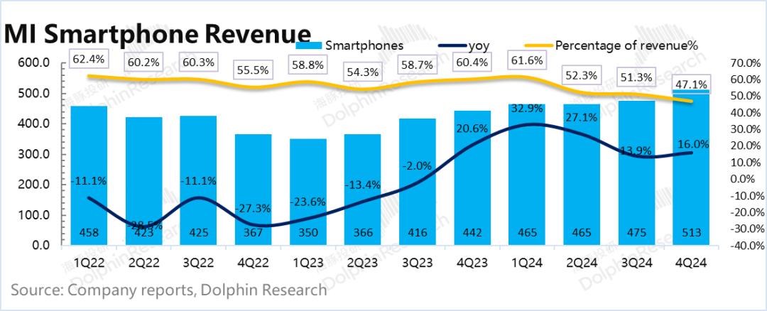 小米智能手机业务于2024年第四季度实现营收513亿元,同比增长至16%。由于第四季度手机的国家补贴还没有开始,主要是一些地方的补贴,这种表现还算不错。