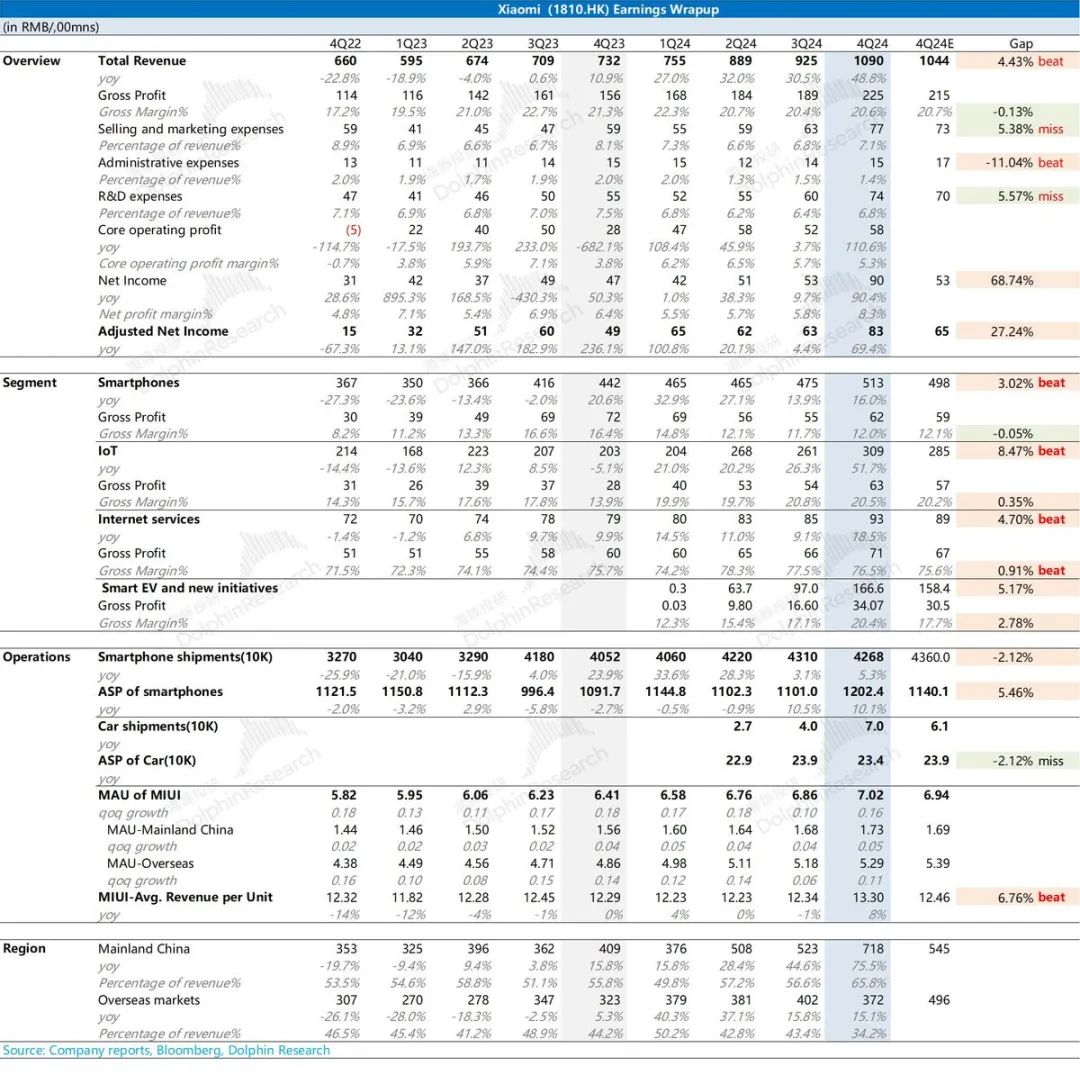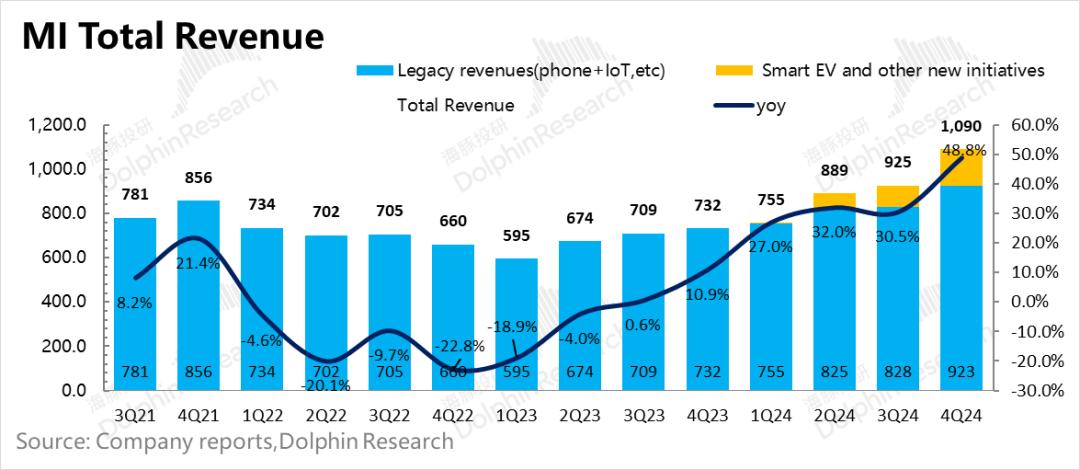 2024年第四季度,小米集团总收入达到1090亿元,比去年同期增长49%,优于市场预测的1044亿元。当然,增长主要取决于汽车和物联网,但真正超市预期的主要原因是物联网,一小部分原因是手机。汽车应该在预期之内。