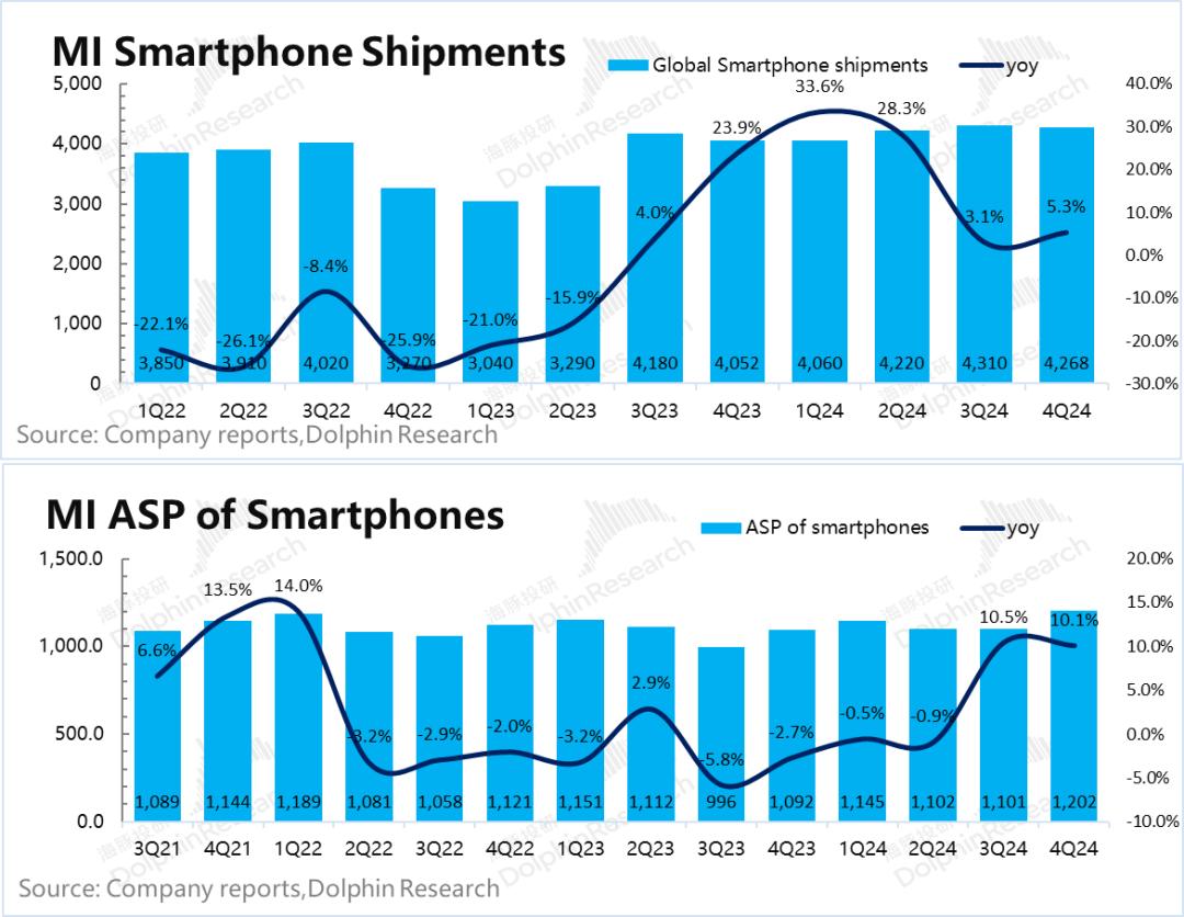 数量:小米智能手机2024年第四季度出货量为4270万台,同比增长5%。