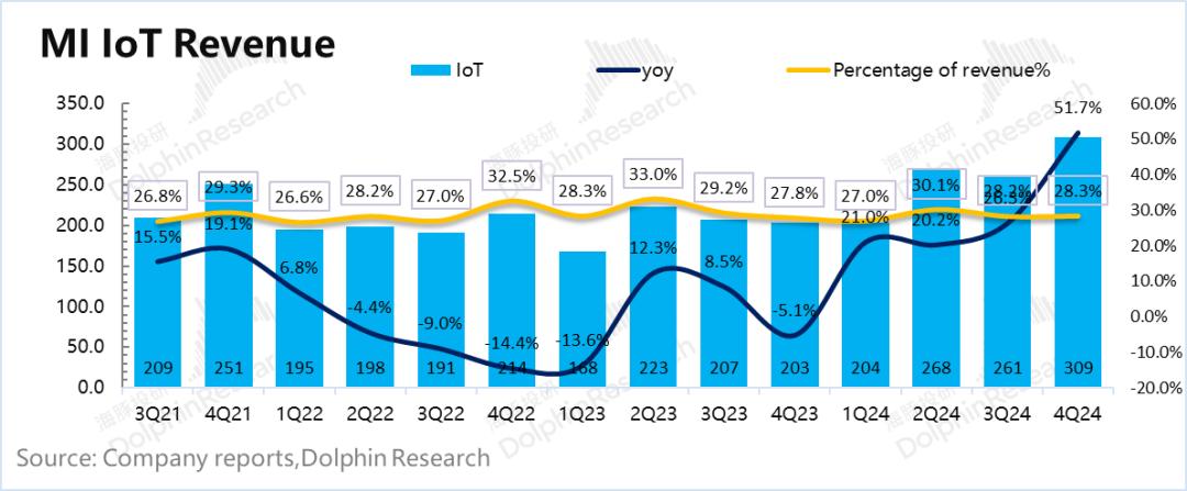 小米2024年第四季度 IoT 实现营收309亿元,同比增长52%。主要是国家补贴推动了传统家电的飙升。比如小米电视单品类第四季度收入直接飙升33%。在家用电器方面,空调销量季节性下降,而洗衣机的销量在补贴下依然存在。