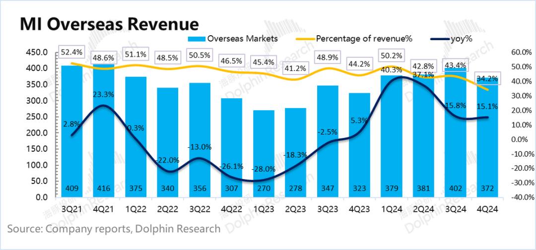 由于中国汽车业务的快速增长,2024年第四季度小米海外收入372亿元,同比增长15%,国际业务占比短期内持续下降。