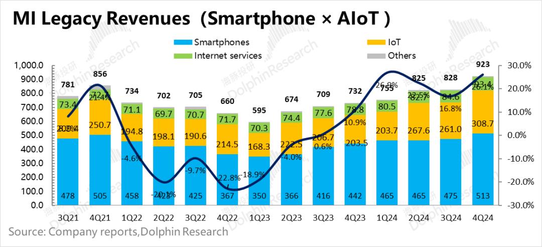 原来的业务-手机X AIoT业务(传统业务)实现收入923亿元,同比增长26%。关键在于IoT,因特网业务表现也算不错;