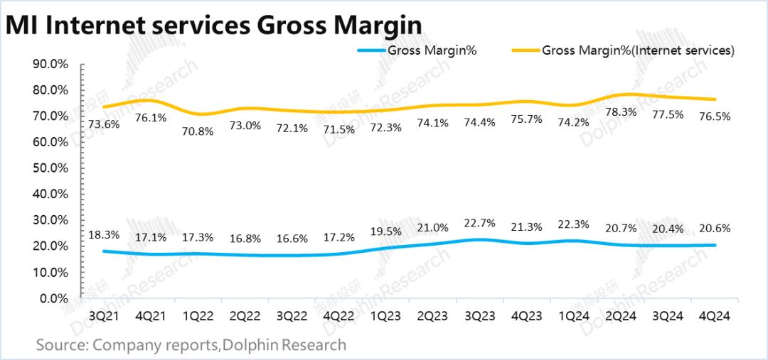 2024年第四季度,小米互联网服务业务毛利率为71.4亿元,同比增长20%,毛利率为76.5%,同比增长近1亿元。%。