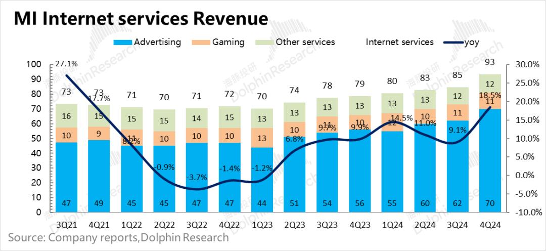 2024年第四季度,小米互联网服务业务实现营收93亿元,同比增长18.5%,也在加速增长,超过市场预期的3亿元。主要增长驱动力仍在广告中: